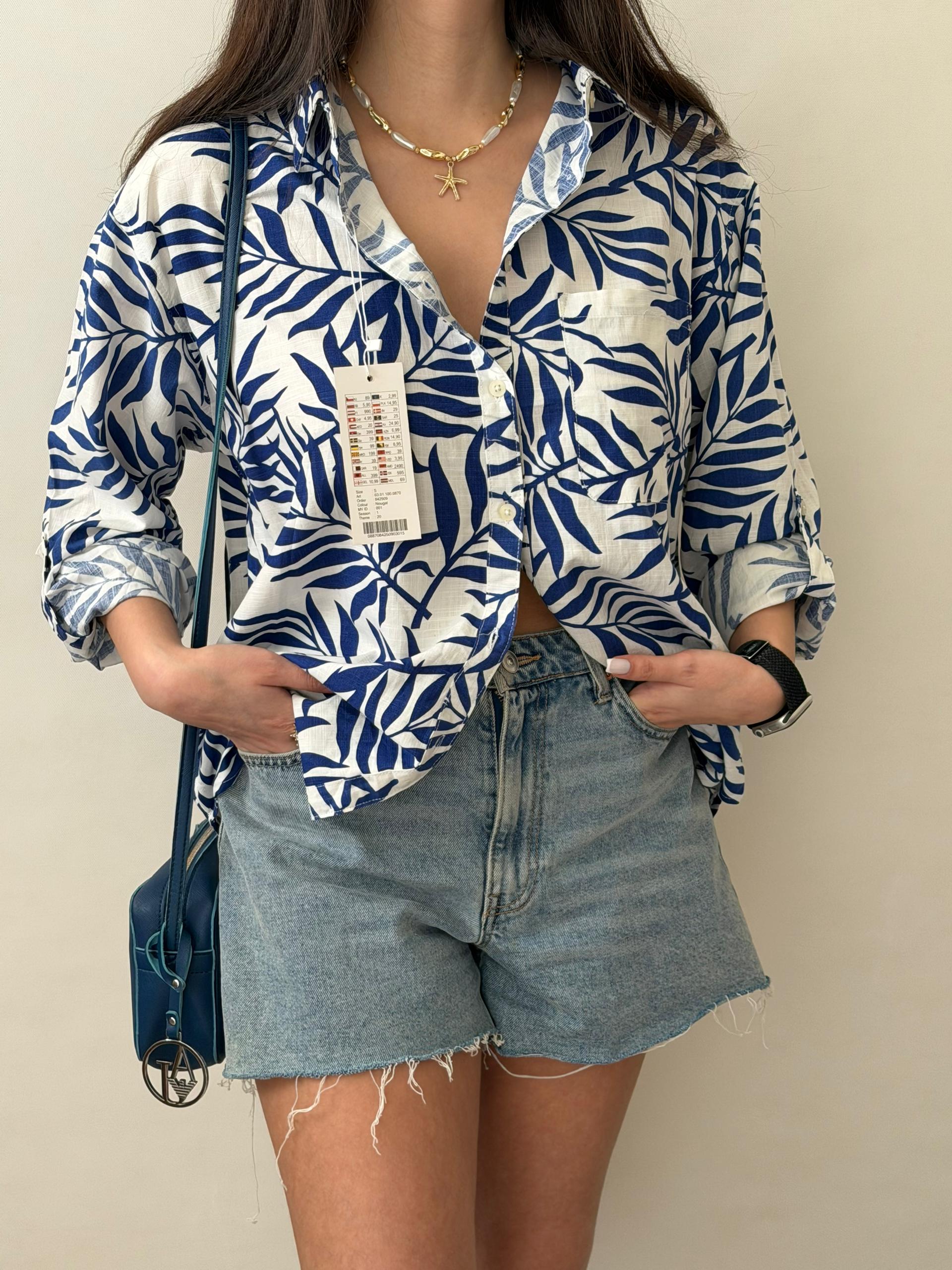 شومیز ۱۰۰٪ لینن طرح برگ آبی استوایی Amisu